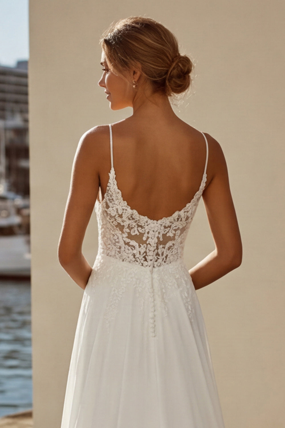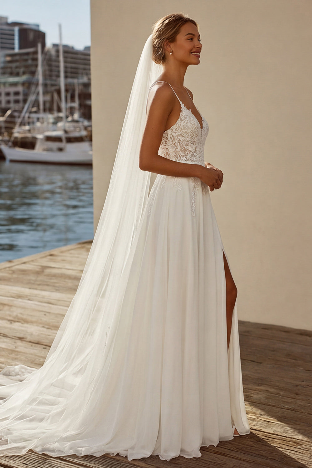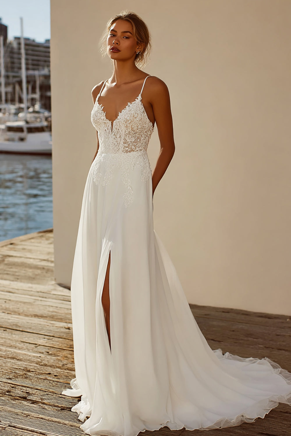 Abito da sposa in chiffon in pizzo in piletta in avorio