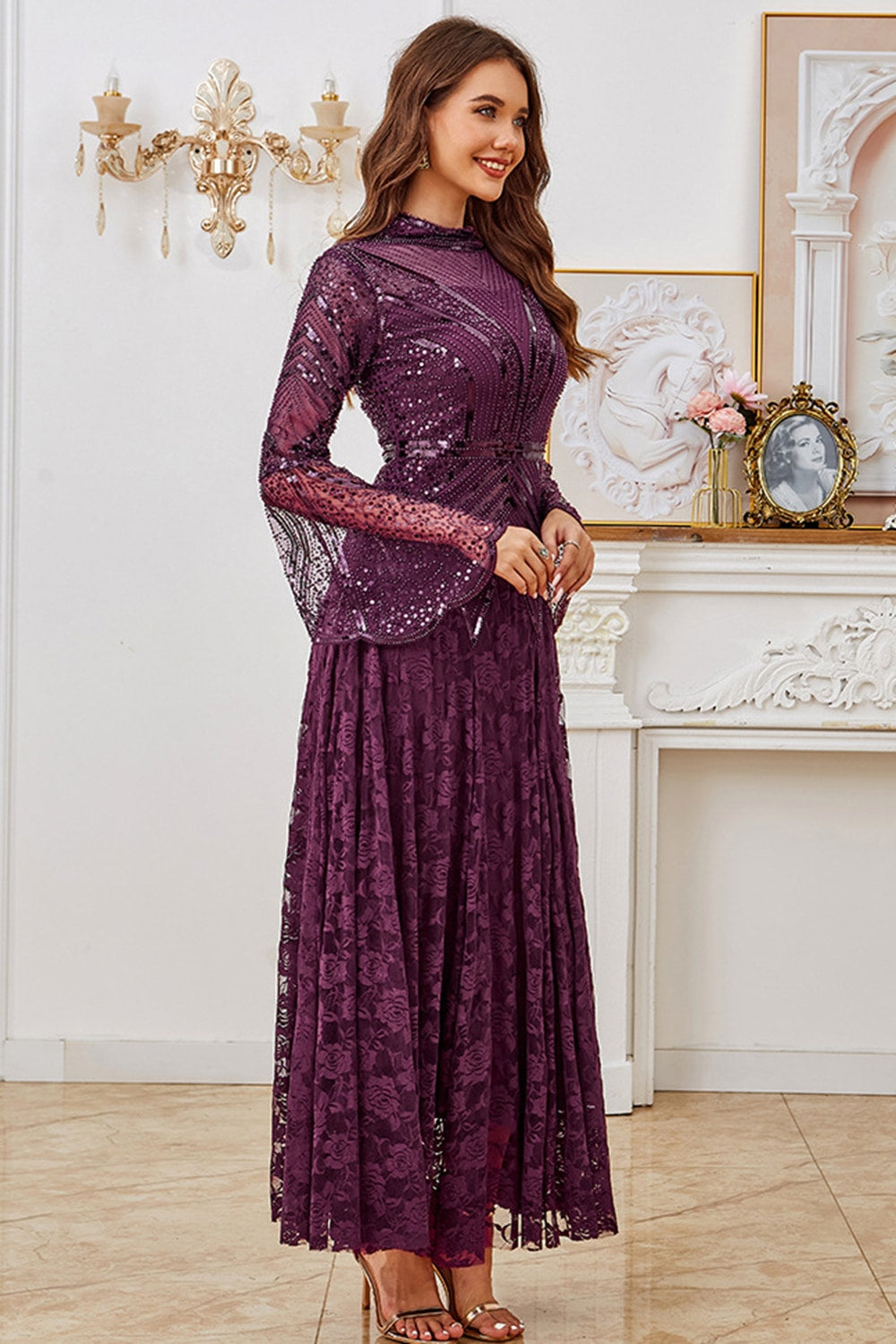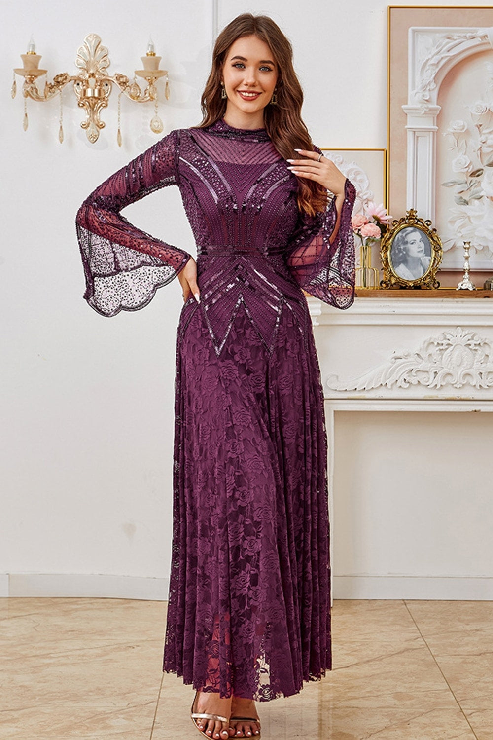 Abito Madre della Sposa con perline viola scuro e maniche lunghe