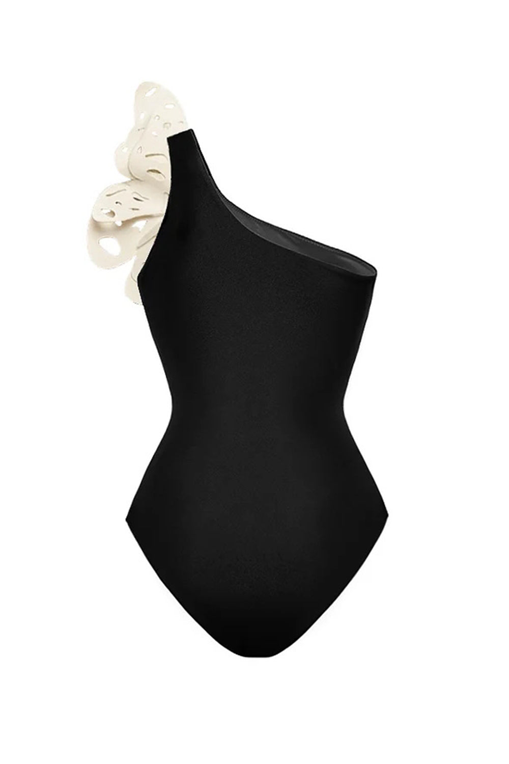 Costume nero a farfalla applicata con una spalla e abito da spiaggia