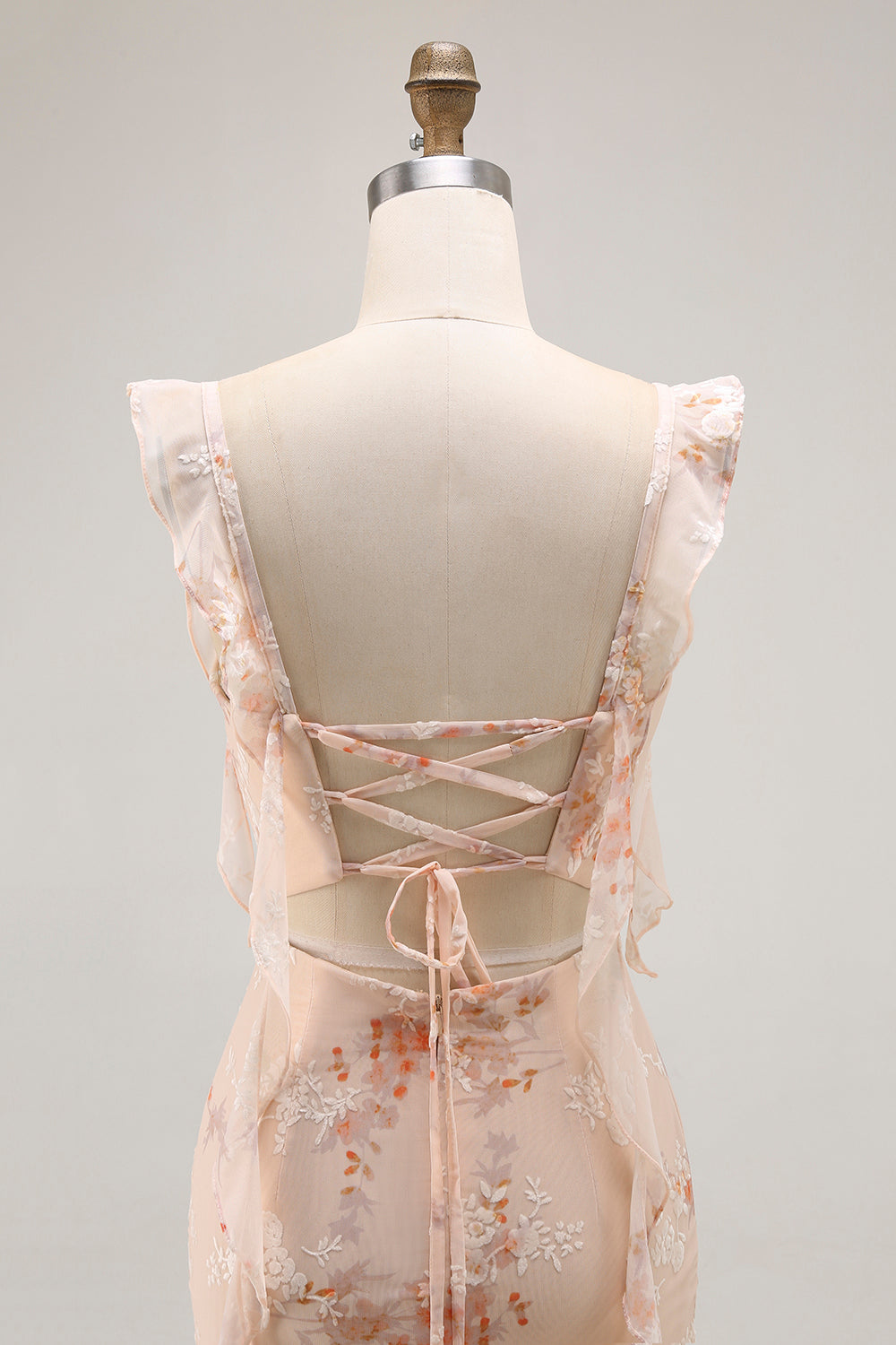 Champagne Floreale Tubino Abito Lungo Da Damigella Con Fessura