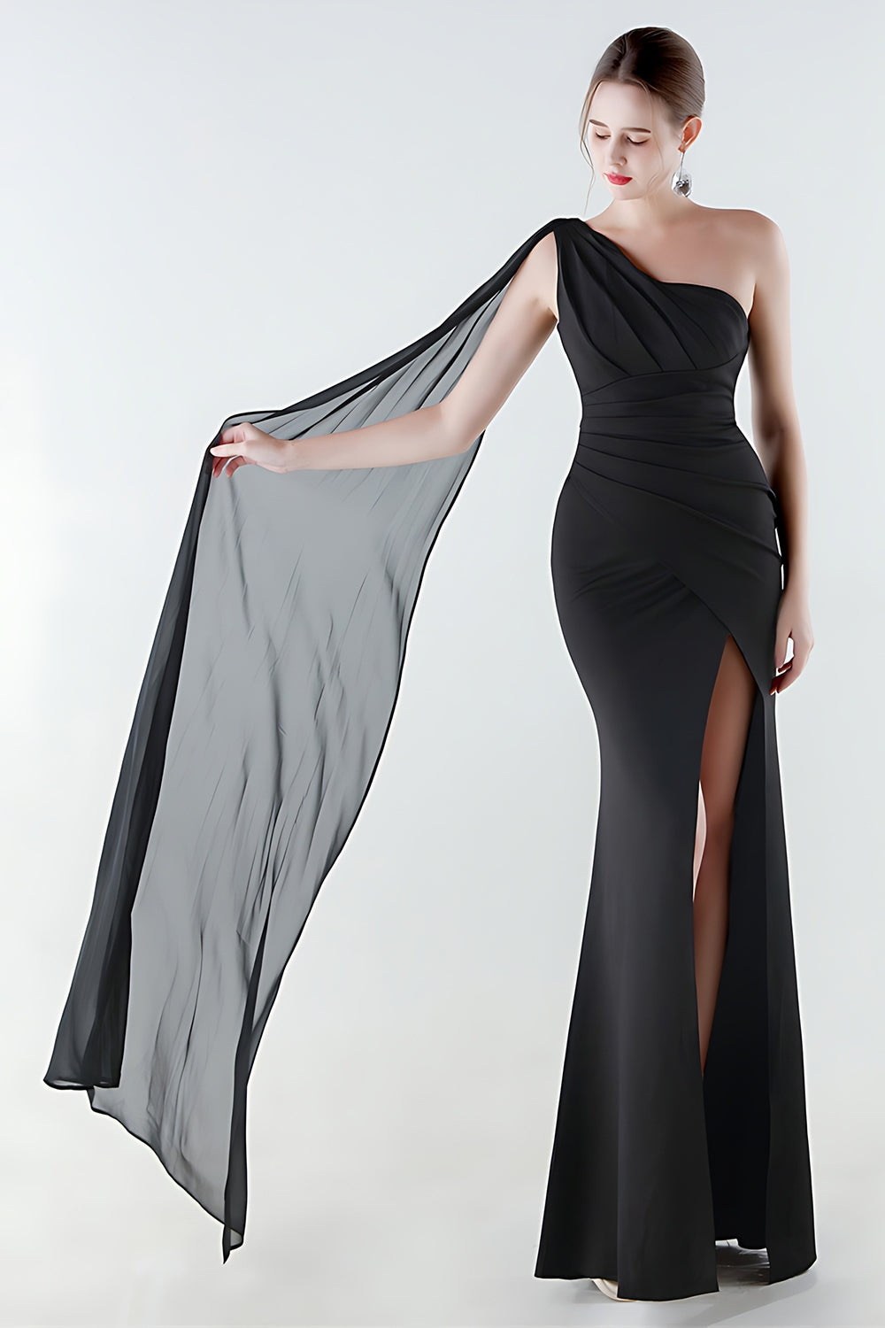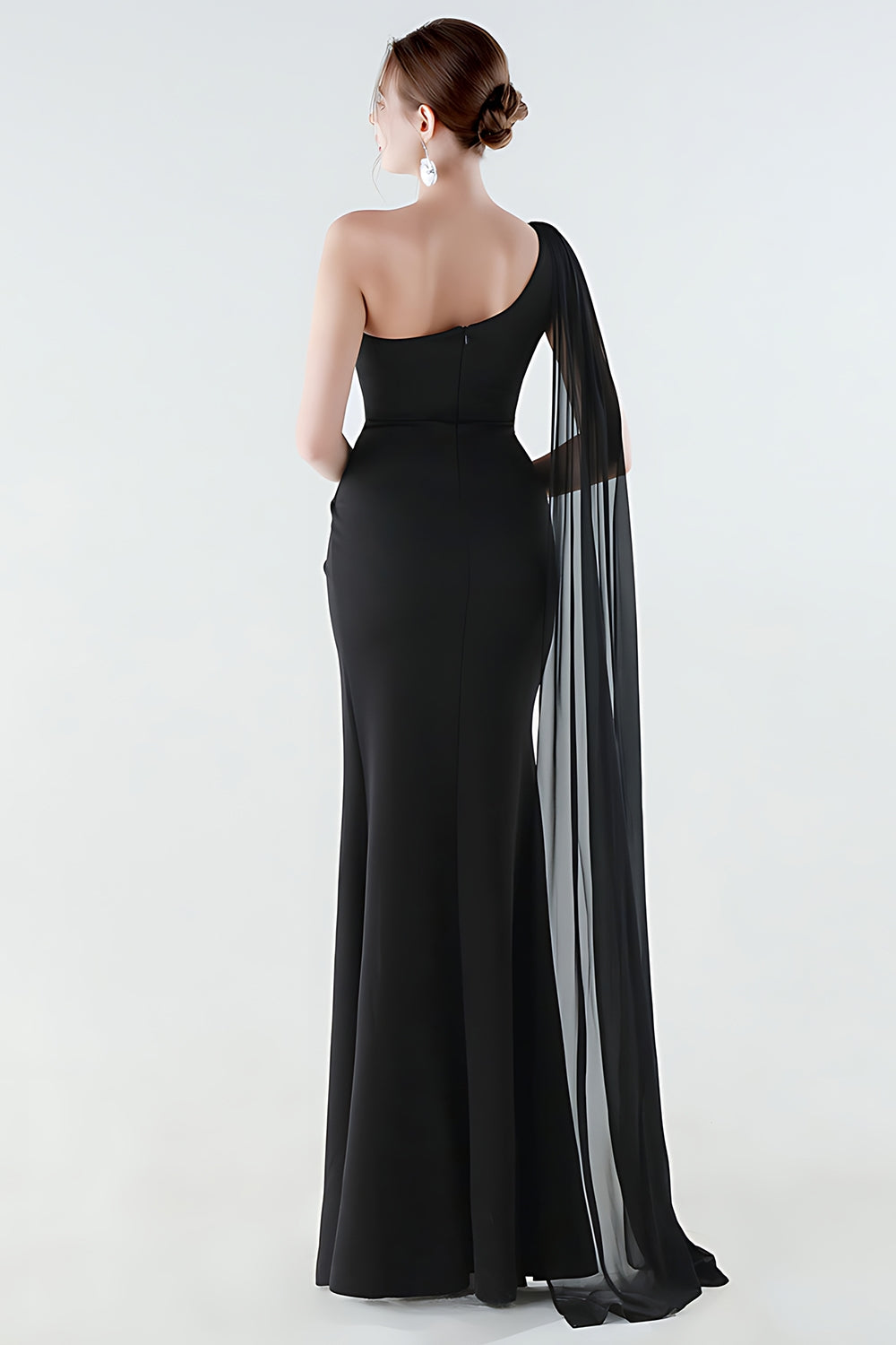 Abito formale nero sirena con una spalla e streamer