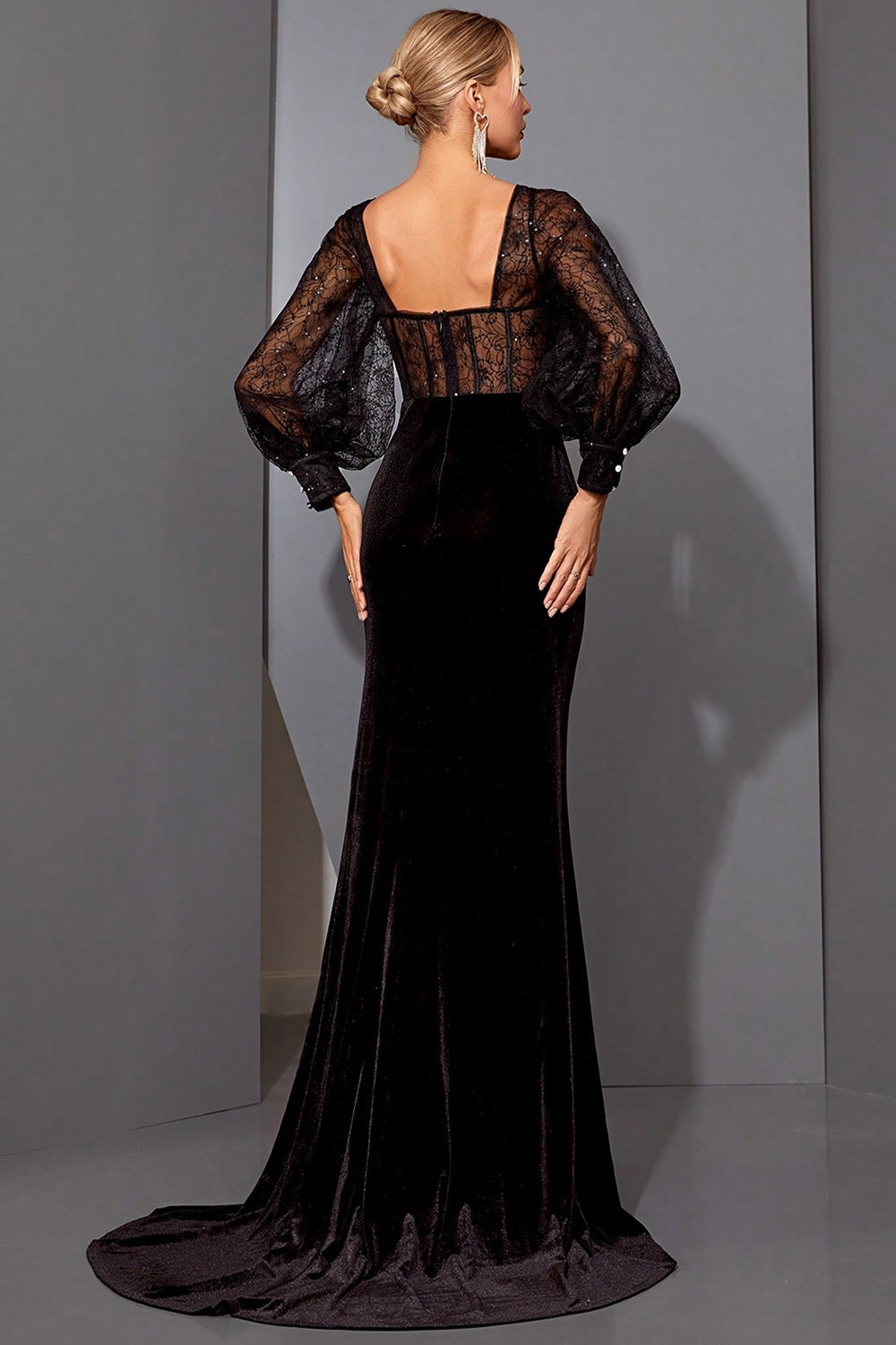 Corsetto di Sirena in Pizzo Nero Abito da Sera Lungo con Fessura