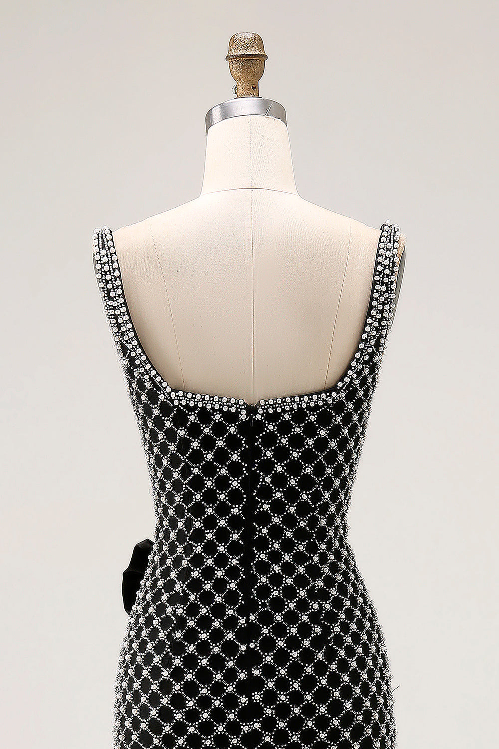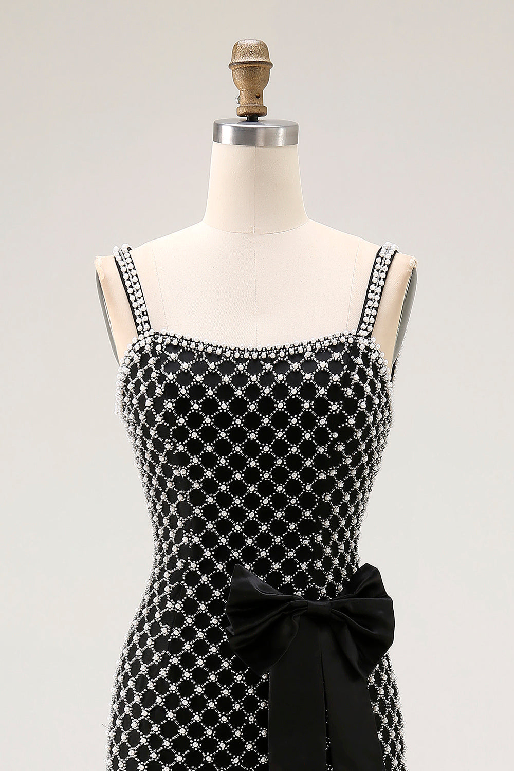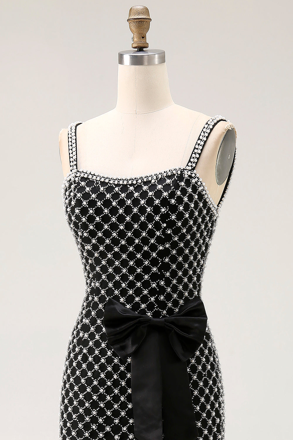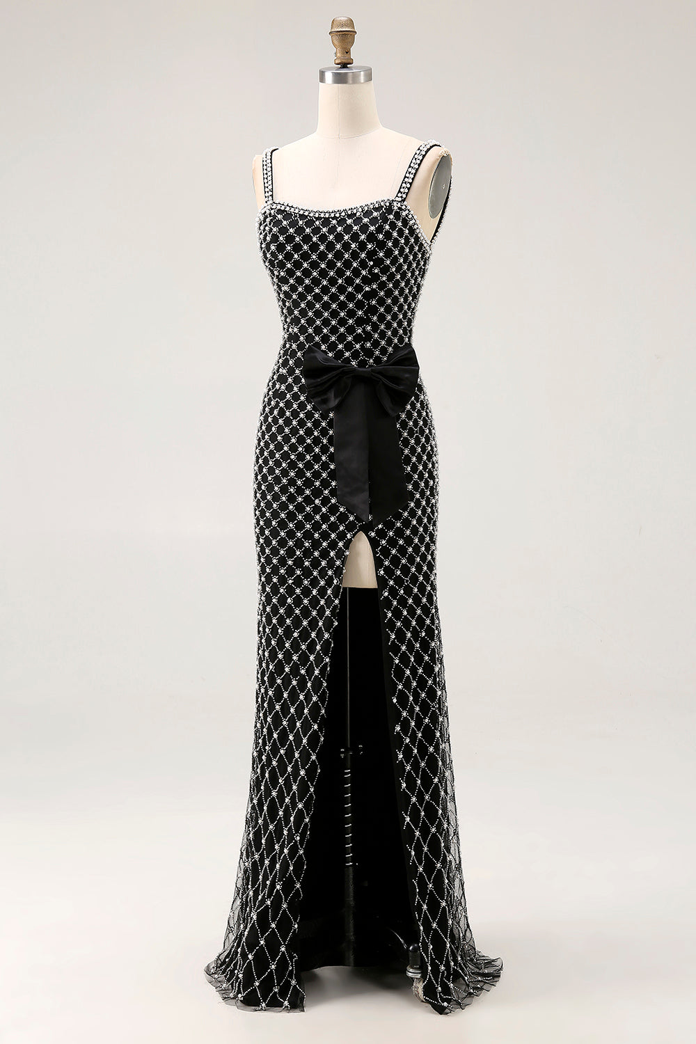 Nero in rilievo sirena spaghetti cinghie strass lato fiocco lungo abito da ballo con fessura