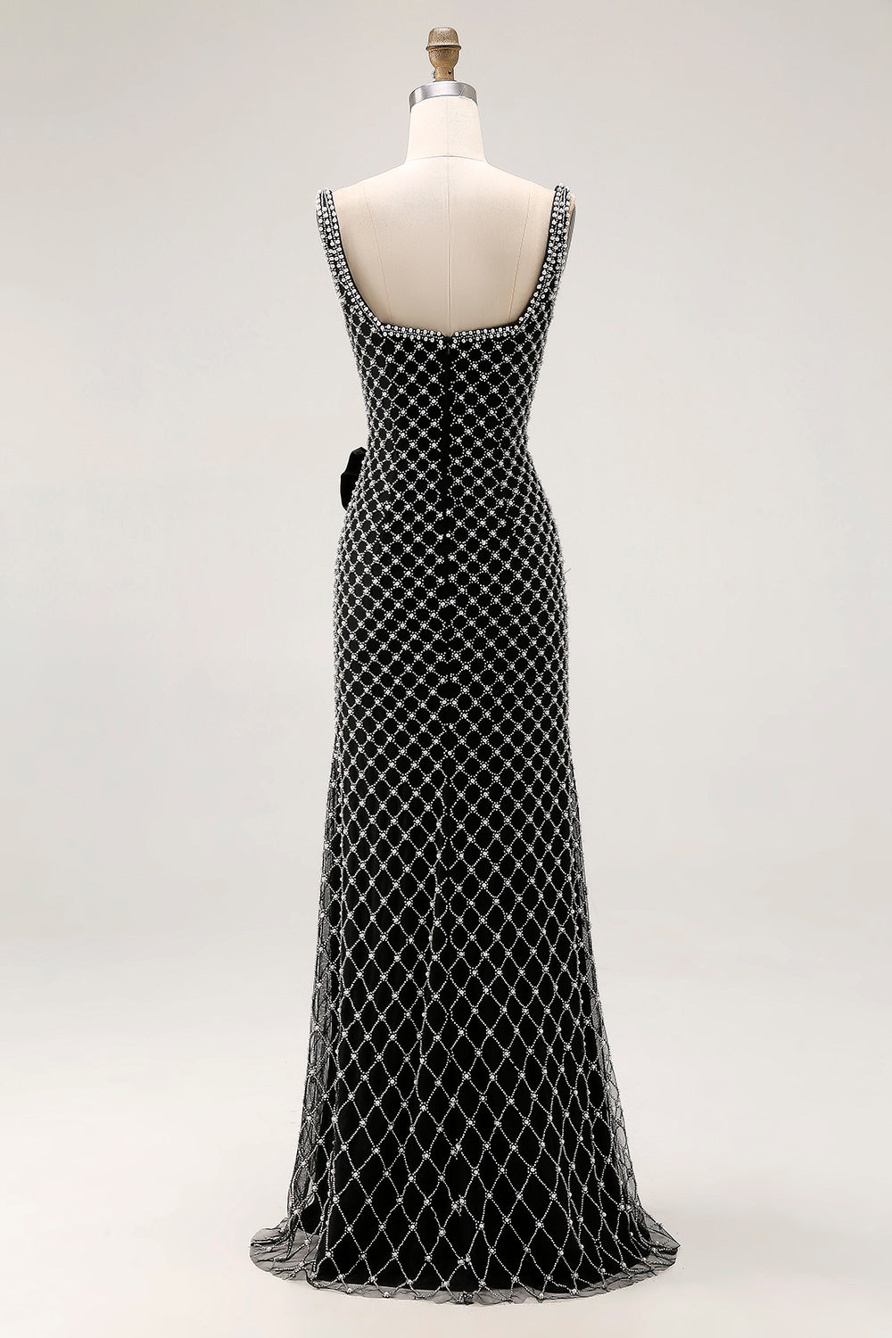 Sirena nera con spalline a perline, fiocco laterale con strass, abito da ballo lungo con fessura