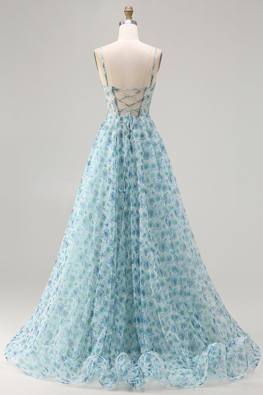 Abito da Cerimonia lungo da ballo decappotabile a linee floreali blu a linea A con spalla e fessura