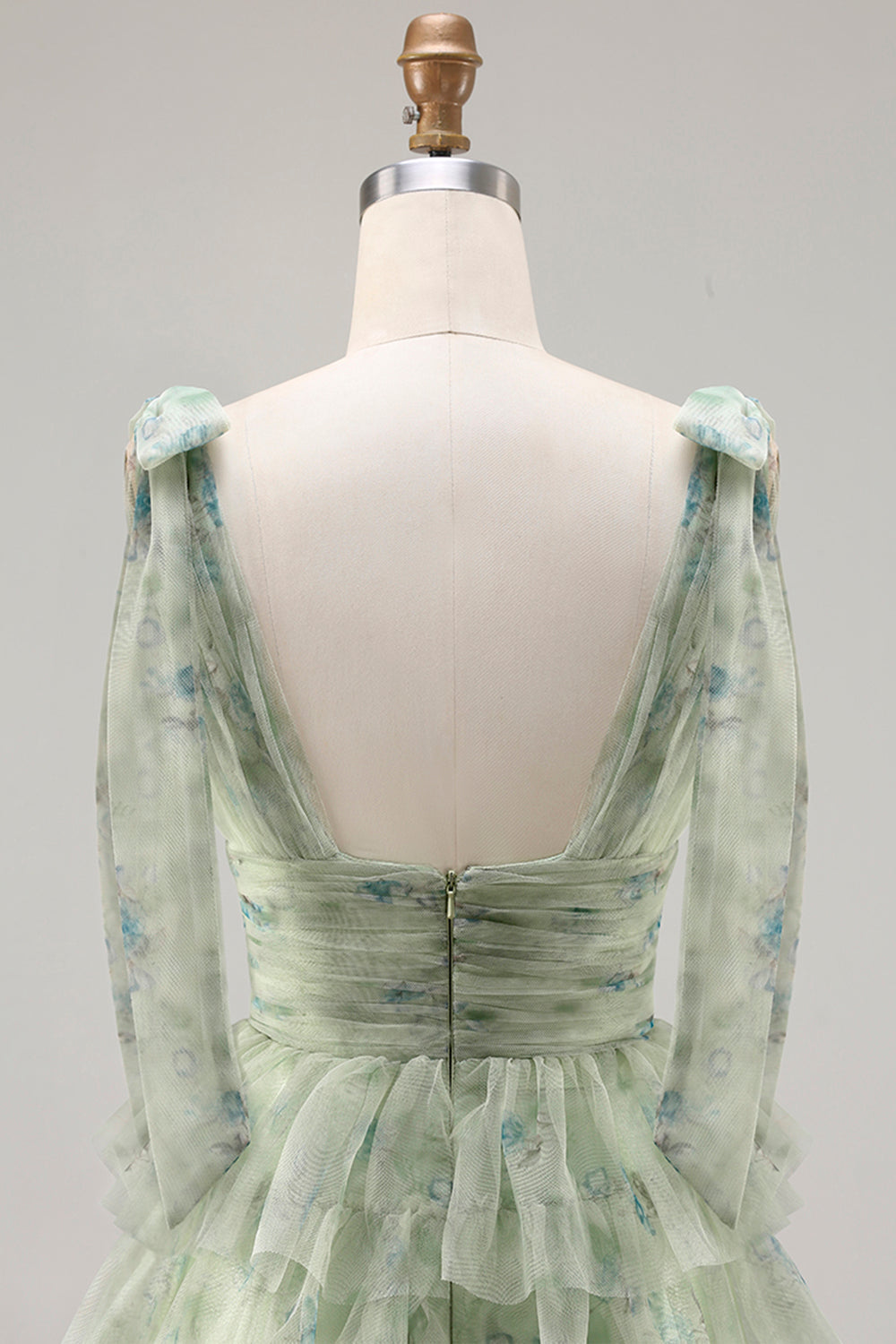 Abito da Cerimonia floreale verde a linee a livelli con lunga fessura