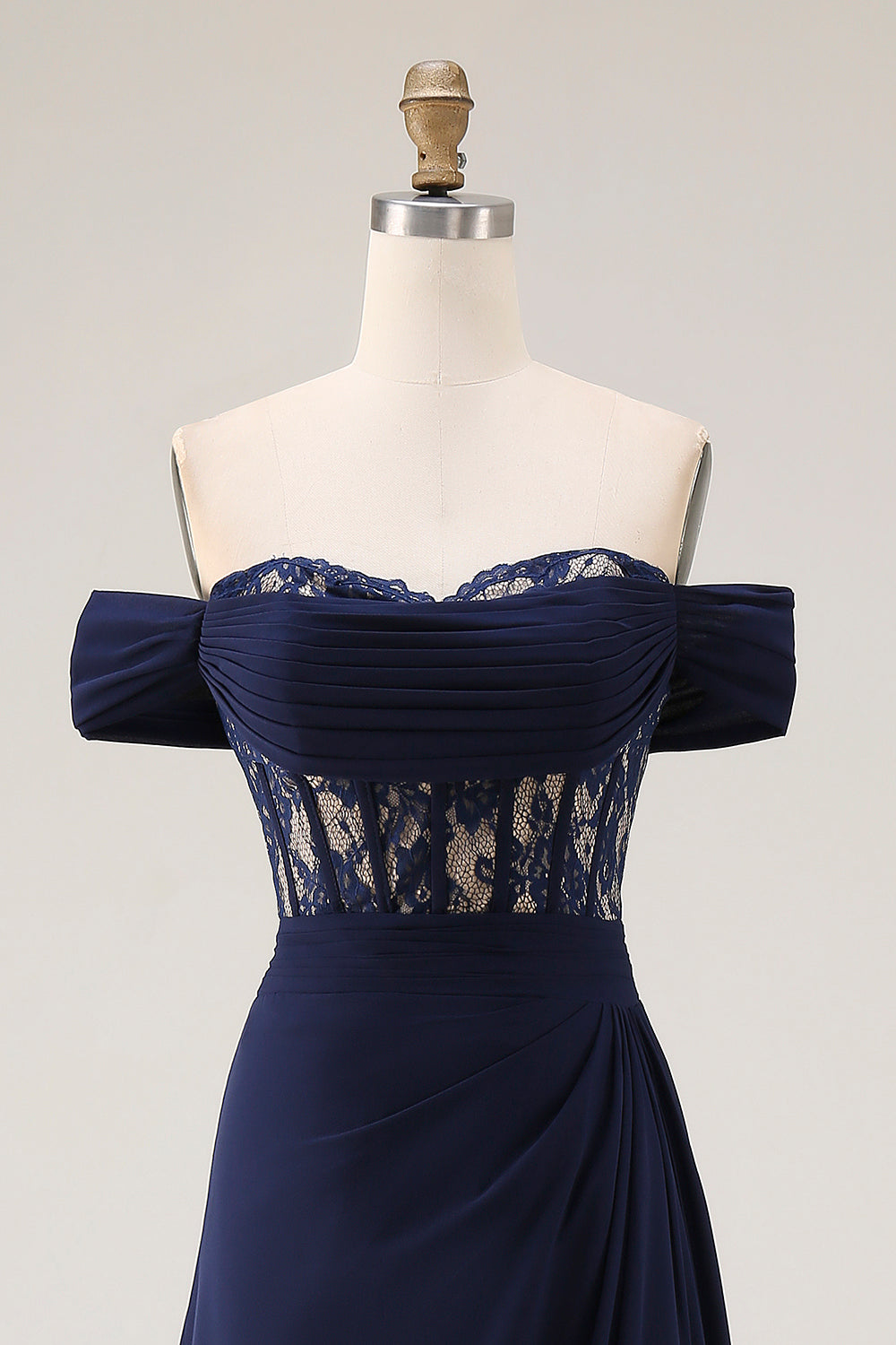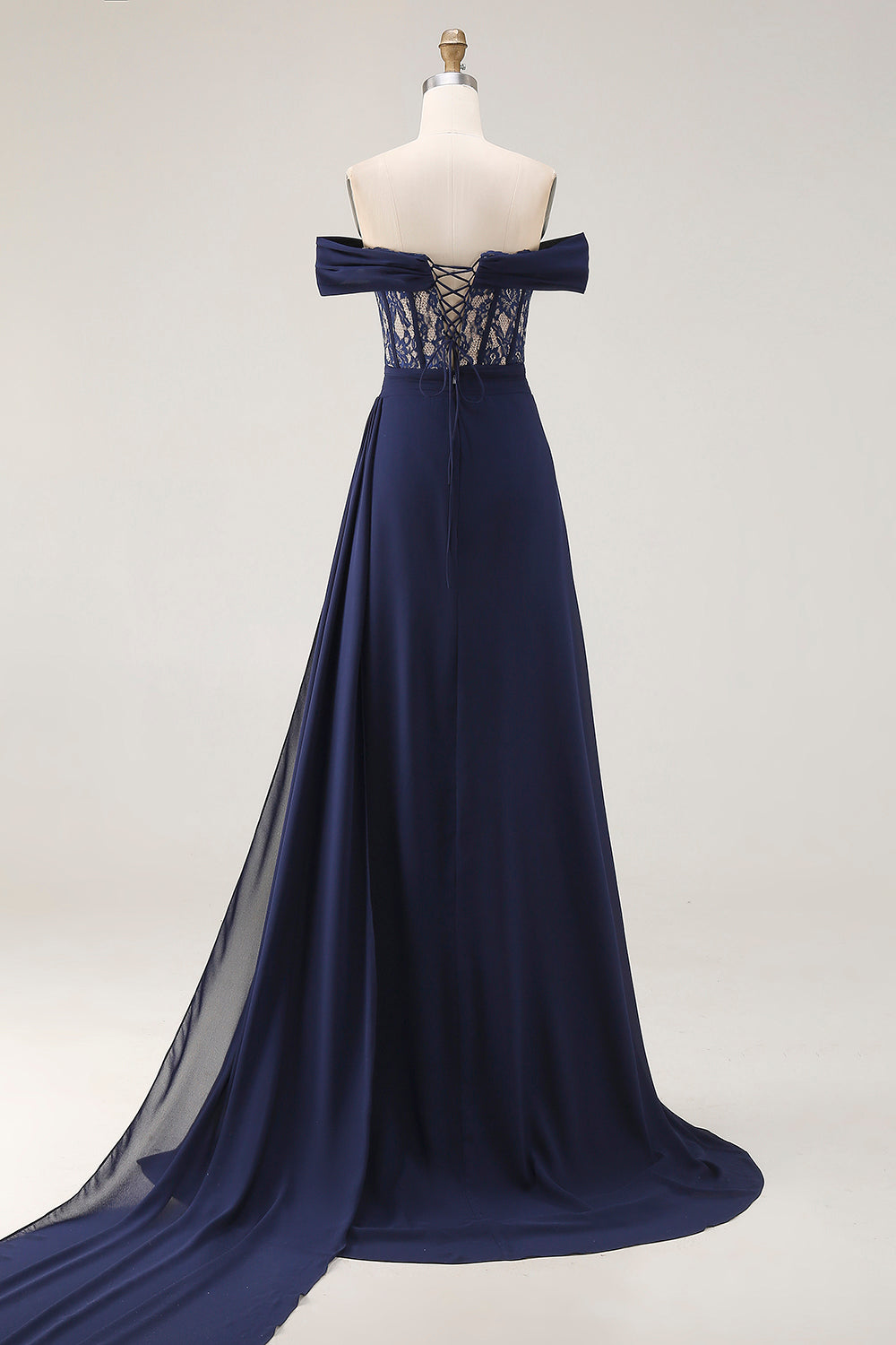 Corsetto a linea a sfondo blu navy con un abito da ballo lungo da ballo con pizzo e dietro