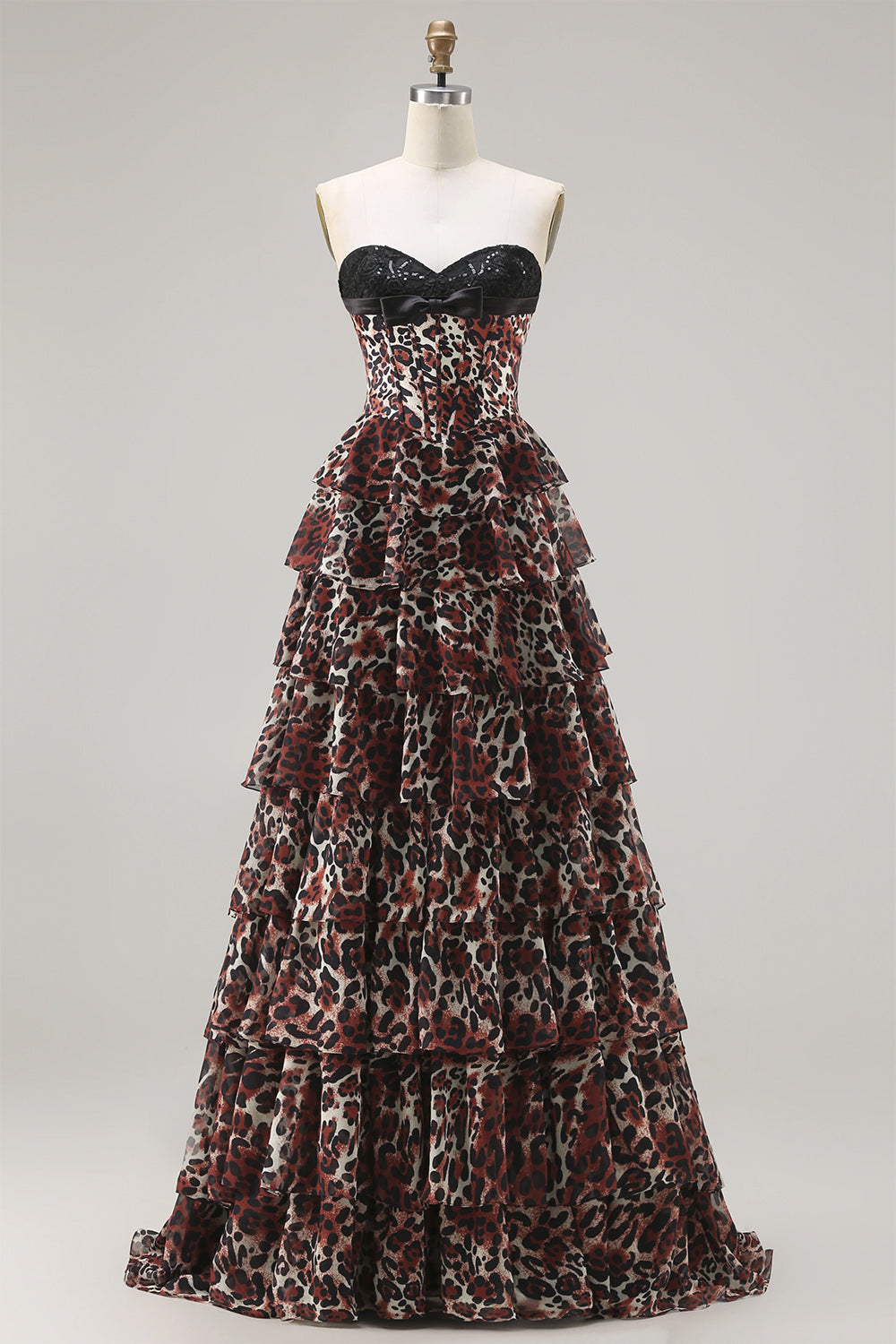 Corsetto da ballo a linea, A A-Line Leopardo marrone, abito da ballo lungo a livelli con volant