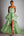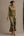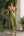 Abito elegante lungo a scollo alto oliva con volant e spacco