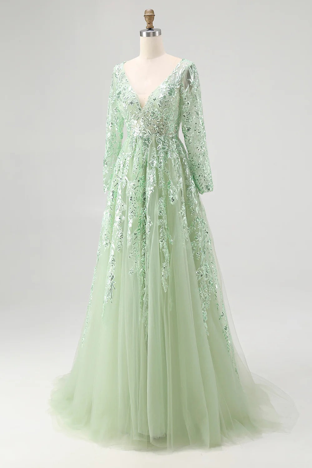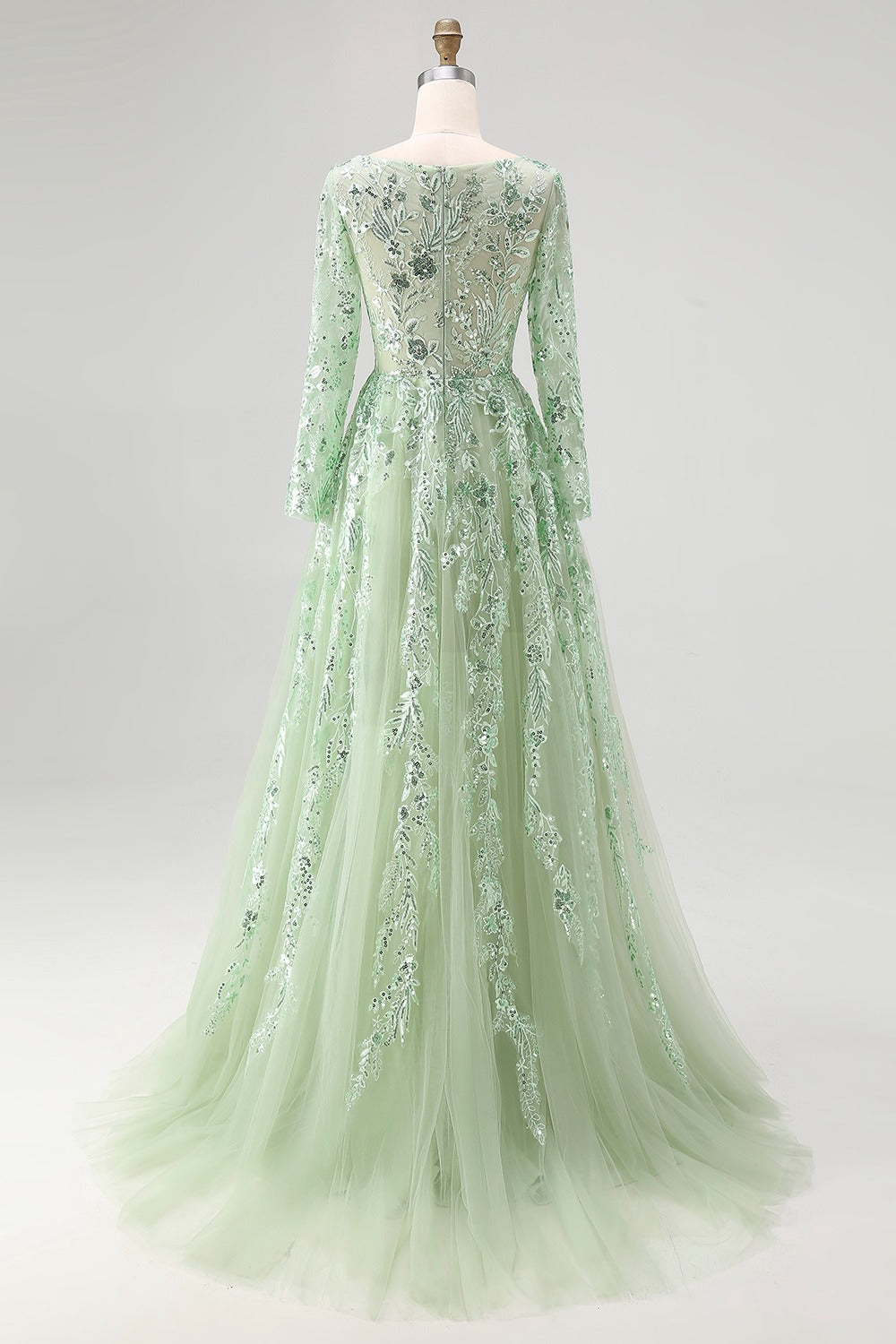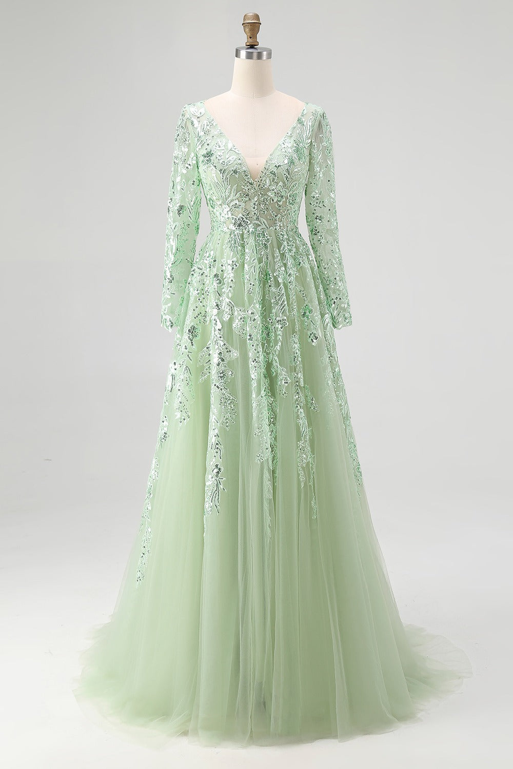 Dusty Sage Lace Applique Tulle Abito da Cerimonia con scollo a V con maniche lunghe